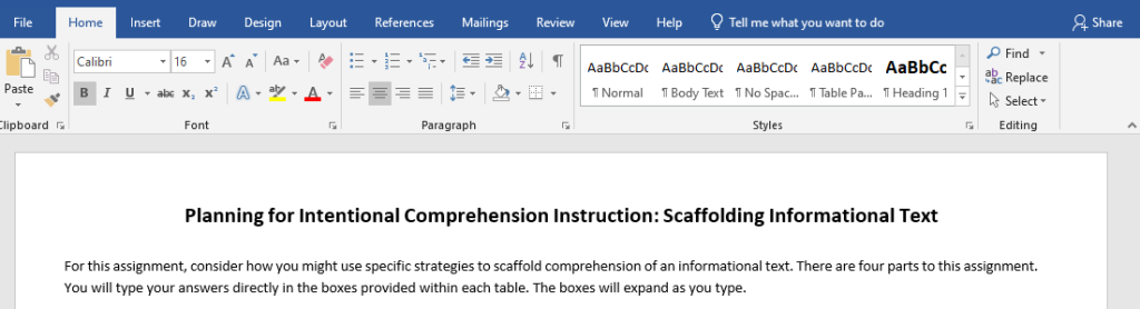 This is a written assignment. You will use the template linked below to complete the assignment. The template includes four parts: 1) General Information; 2) Analyze Text Complexity; 3) Support Text Structure Awareness; 4) Responding to Reading. The resources in the Module are designed to support your development of each part of the assignment.