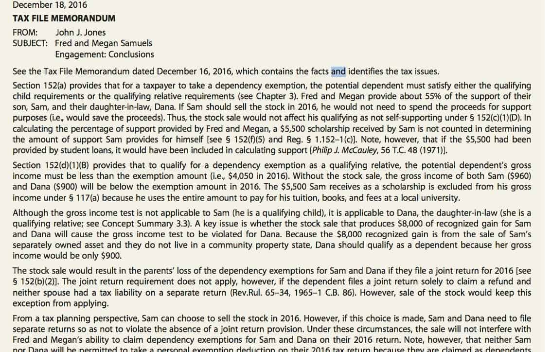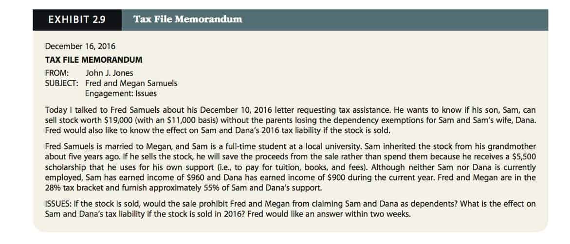 Write a tax memorandum for this research problem which should include sections for facts, issues, an analysis and a conclusion. It is due on week 6. Review Chapter 2 prior to preparing the memorandum, specifically the examples on pages 2-30/31.the research paper should follow