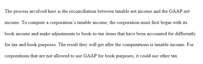 1.Briefly describe the process of computing a corporation’s taxable income assuming the corporation must use GAAP to determine its book income. How might the process differ for corporations not required to use GAAP for book purposes?