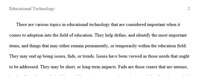 “Select three topics in educational technology and explain why they are “hot” and how you became aware of these topics. Explain whether you believe each topic you identified is an issue, a fad, or a trend. Justify your position by providing citations and references from others in the field. Include the potential for these technologies and who is promoting them.”