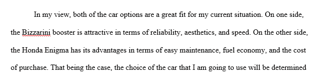 Complete Problem 1 from the end of Chapter 2: You have just graduated from college and are looking to buy your first car. Money is tight right now, so you are concerned with initial cost as well as ongoing expenses. At the same time, you don’t want to drive a slow, ugly car like your parents do. You have narrowed your choices down to two vehicles: a Honda Enigma and a Bizzarini Booster. Based on the rankings in the table (found under Chapter 2, Problem 1 in the textbook), calculate the value index for each car. Which car provides you with the greatest value? Use formulas to calculate the answer to one decimal point. Respond to at least two of your classmates’ postings.