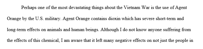 The Vietnam War involved the use of a chemical that is responsible for lingering effects to military service members and civilian population. Two such substances are napalm and Agent Orange. Are you aware of anyone suffering from the lingering effects from either one of these chemicals? Do you believe the use of such chemicals should be allowed in future wars? Why, or why not?