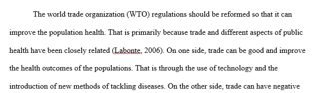 In a Word document, write a short essay (300 words) to answer the following question: * Should World Trade Organization (WTO) regulations be reformed to improve population health? Why or why not?